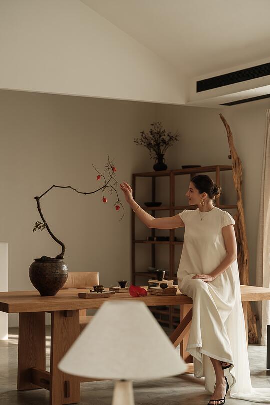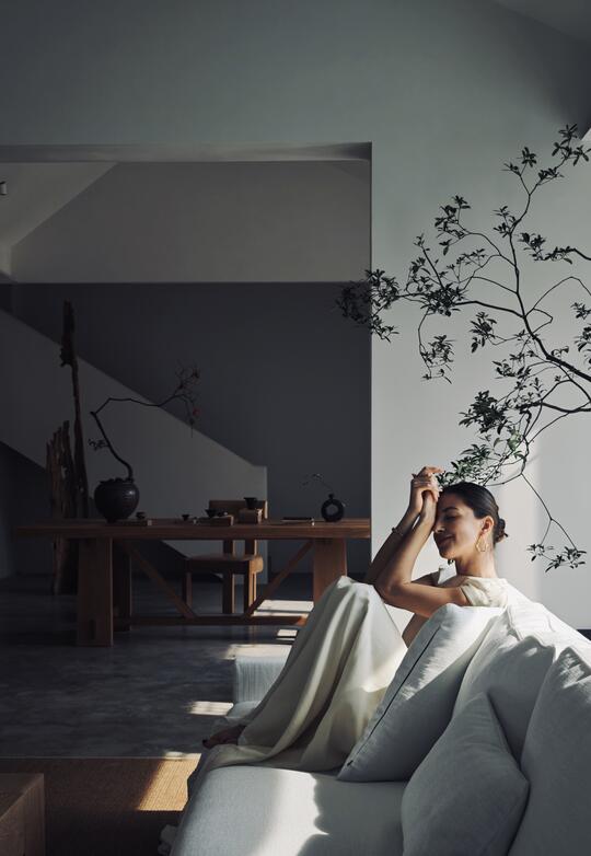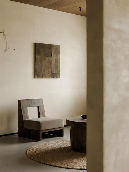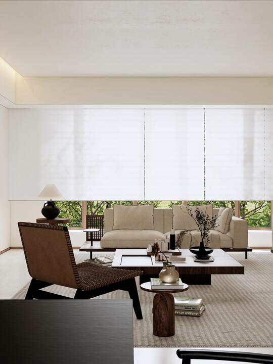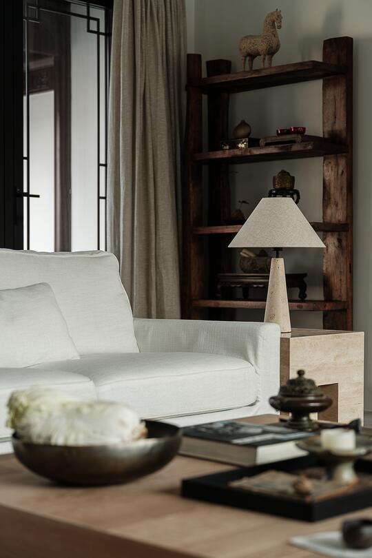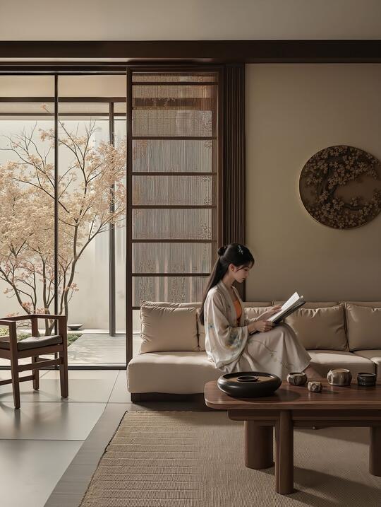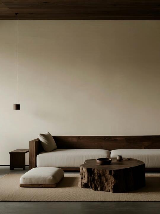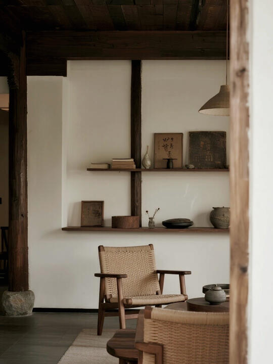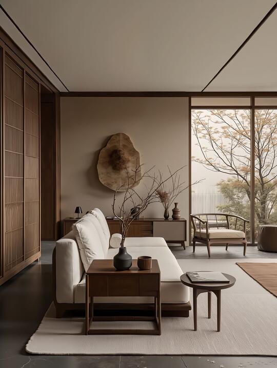 自然材质、中性色调、低矮家具、框景与借景、不对称平衡、静默与留白