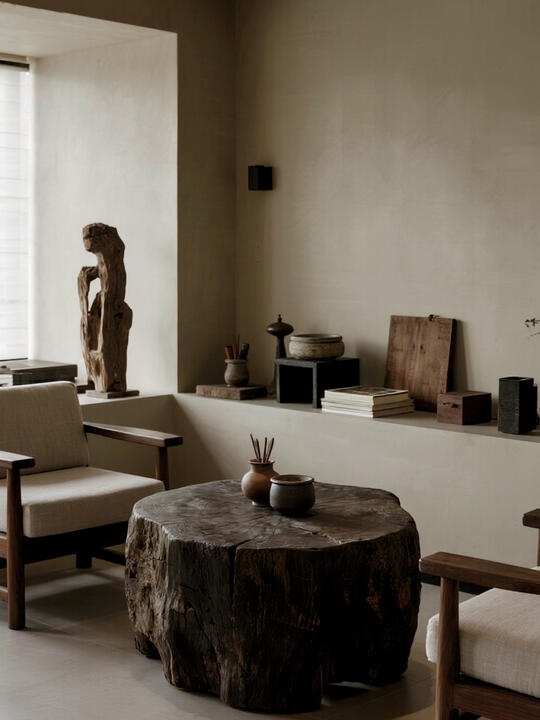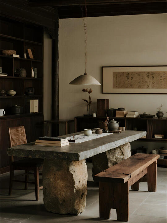 材料: 自然材质:木材、石材、竹材、棉麻织物、纸张 现代材质:金属、混凝土、玻璃 注重自然元素的融入和材料本身质感