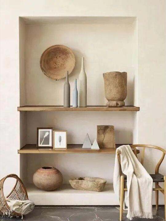 如果色彩是高饱和度亮色、数字化色彩,采用金属等未来感材料、空间特别明亮的就不是侘寂风。 侘寂风与斯堪的纳维亚风的区别 侘寂风强调: 幽冥空间+原生材料 陈旧肌理(如剥落墙面+风化木梁)、粗糙表面、不完美 孤寂感(如单一陶器置于空荡桌面)、手作感 斯堪的纳维亚风强调: 明亮空间+自然光线、自然元素 干净简洁的线条、整洁干净、重视收纳 工业化设计 大面积的白色或者浅色原木色的应用 侘寂风与
