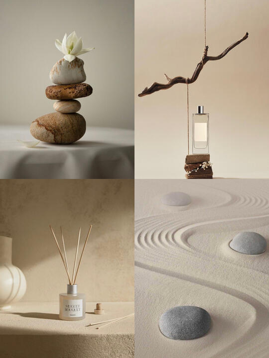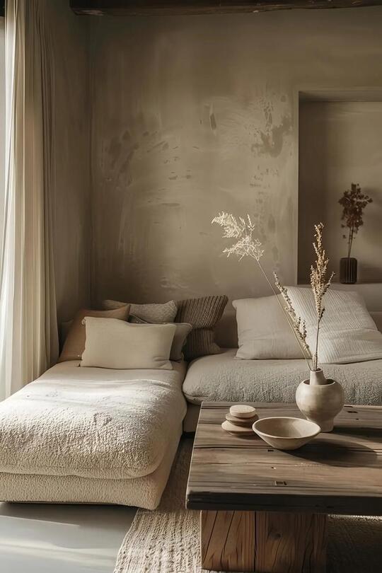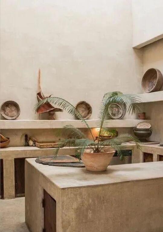 粗陶、不完美、斑驳;低饱和自然色(灰白、陶土色),原始材料(粗陶、原木、亚麻),手作感、不规则、空寂留白。