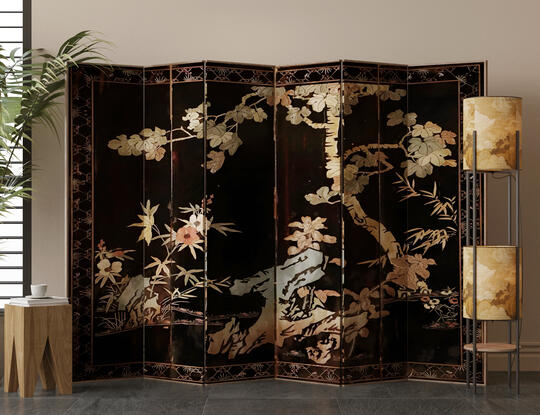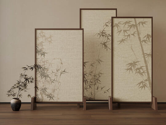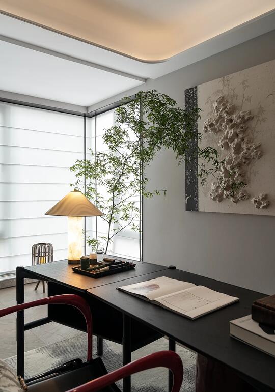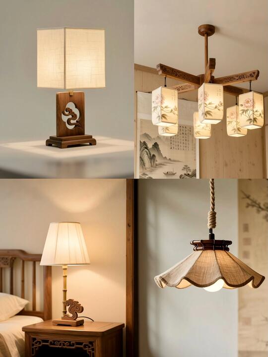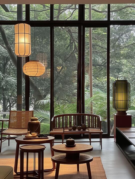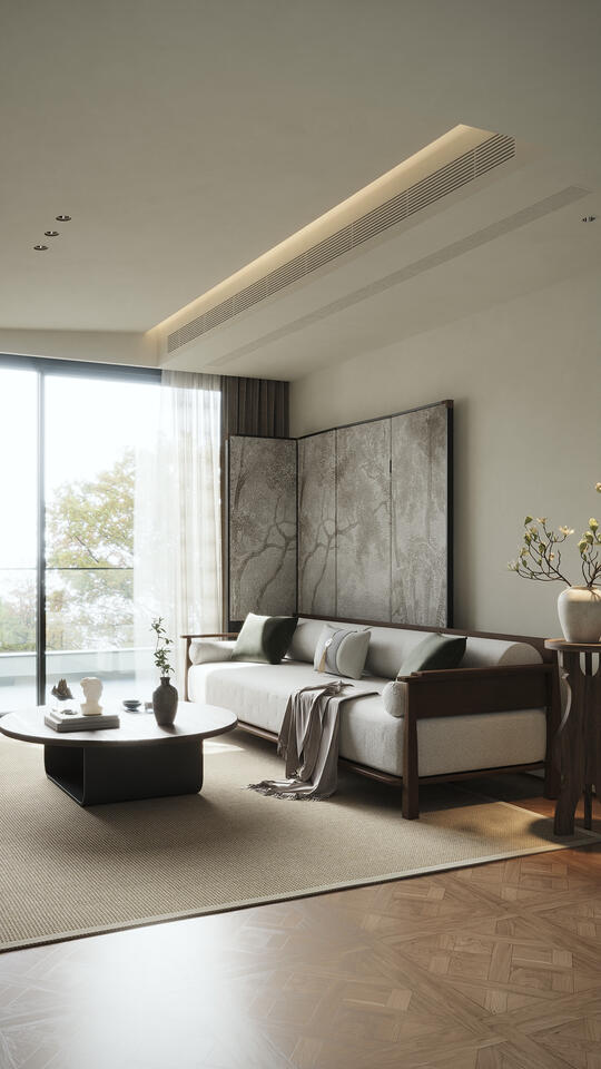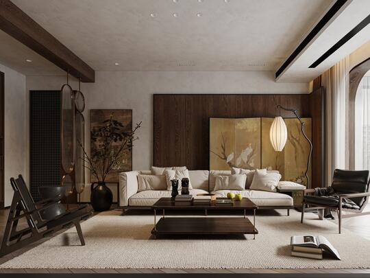材料: 自然材质: 实木(胡桃木、橡木、榆木、黑檀等深色或原木色)、石材(水墨山水纹大理石)、竹、藤、棉麻、真丝、陶瓷、香云纱、宋锦等。 现代材质: 金属(黄铜、黑钢)、玻璃、混凝土、亚克力(形成质感对比) 触感:强调哑光质感