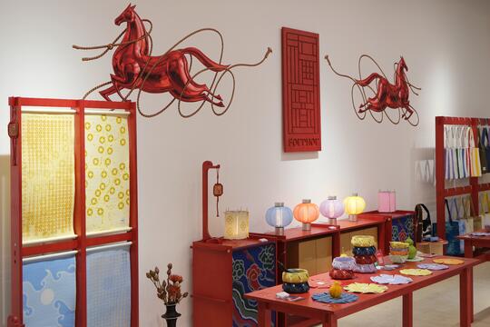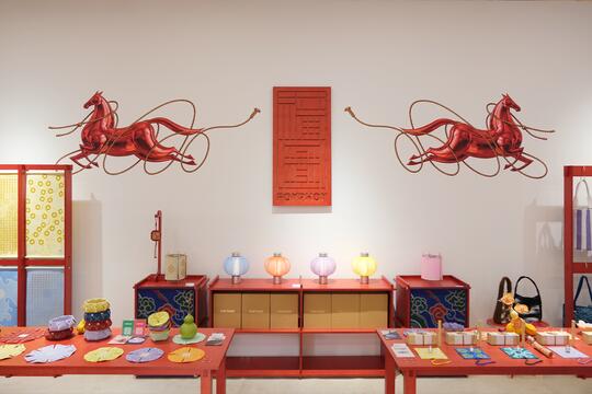 盘扣、立领、宽袖、对称结构、祥云、龙凤图案、斜襟/对襟、刺绣、流苏、提花、棉麻、真丝、陶瓷、香云纱、宋锦、水墨印花、山水纹样、书法元素、传统织锦、刺绣工艺