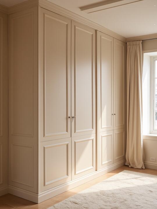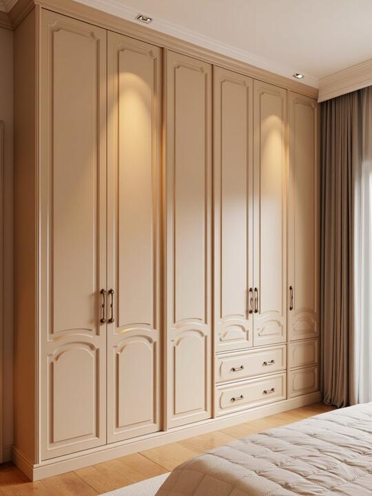 拱形、曲腿、护墙板、墙面分层处理(石膏线+木饰面)、奶油白、格子窗