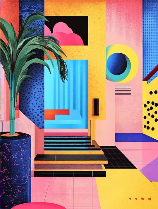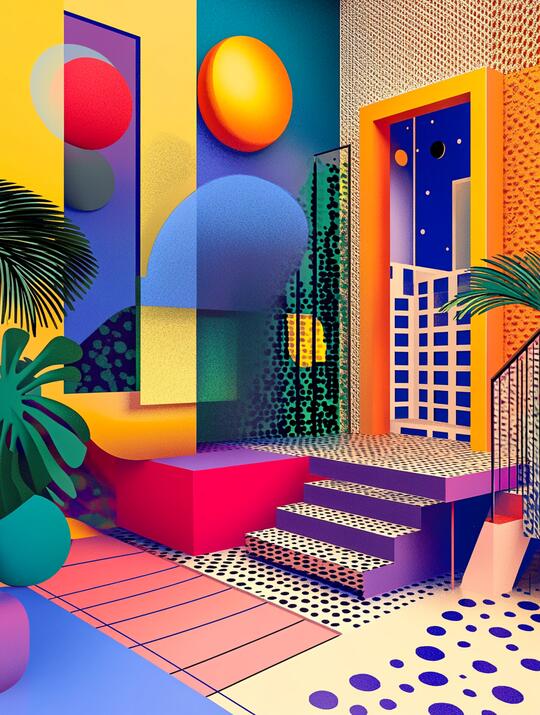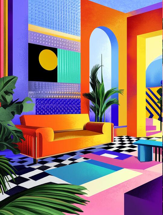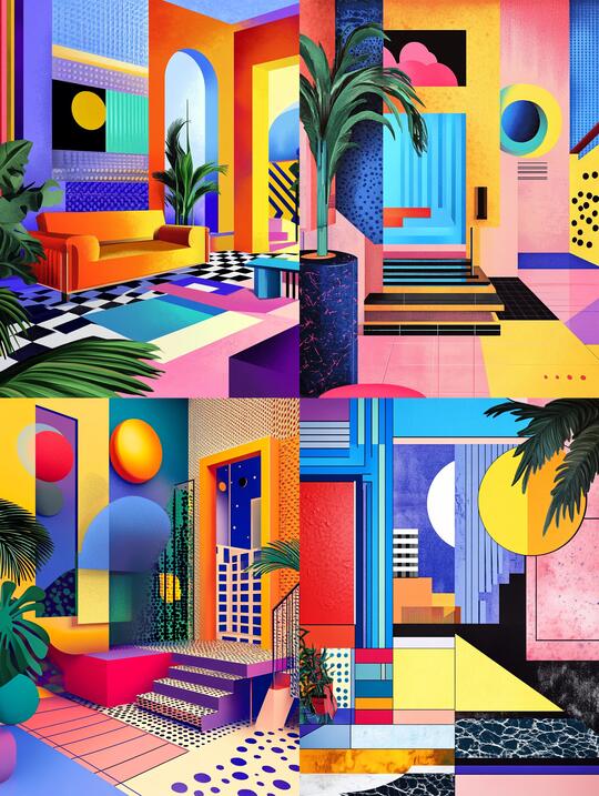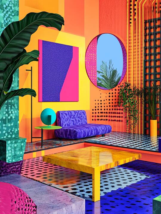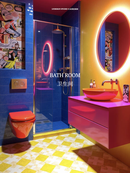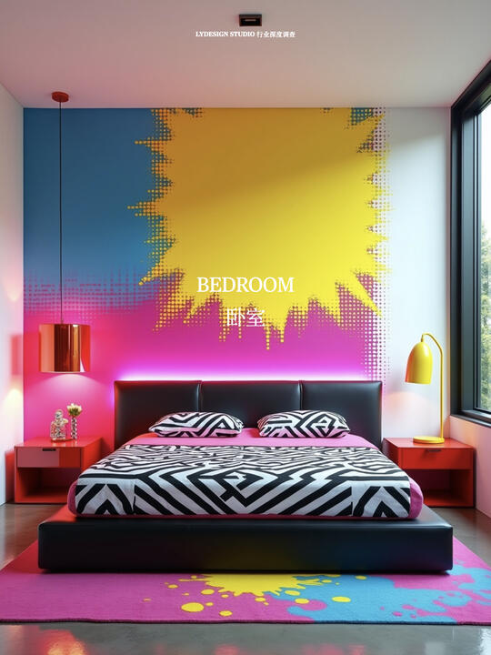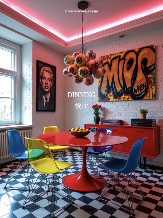 色彩: 主色调:红、黄、蓝三原色,其他高饱和度流行色,玫红色、橙色 辅色:黑、白、紫、蓝、本戴点 (由青色、品红、黄色小圆点组成的网格) 核心是夸张、艳丽、炫目,但通过白色点缀和协调与对比关系的把握,实现活泼生动又相对和谐的空间氛围,