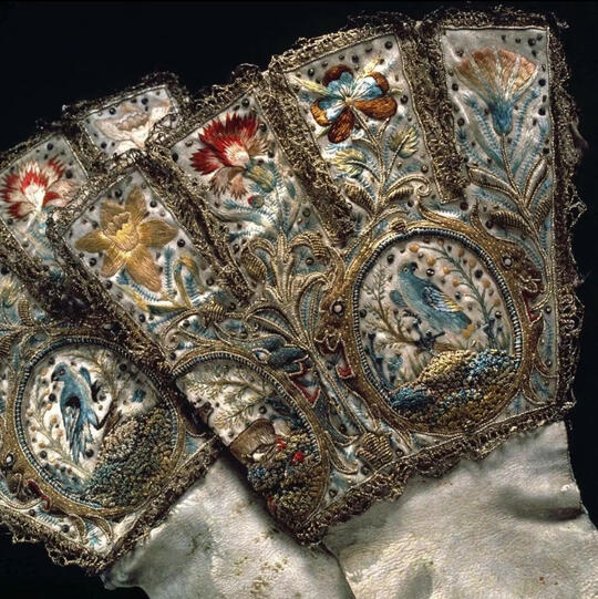 繁复装饰、蕾丝、裙撑、X型廓形、曲线造型、色彩浓郁华丽,图案密集、混搭