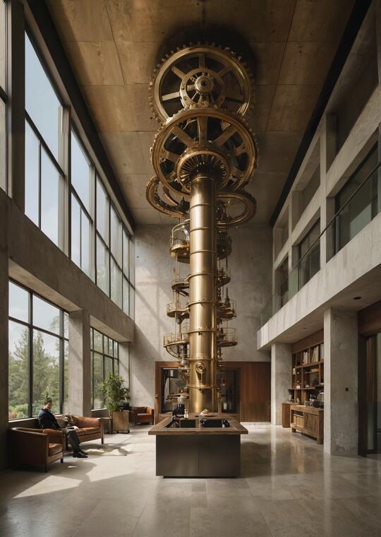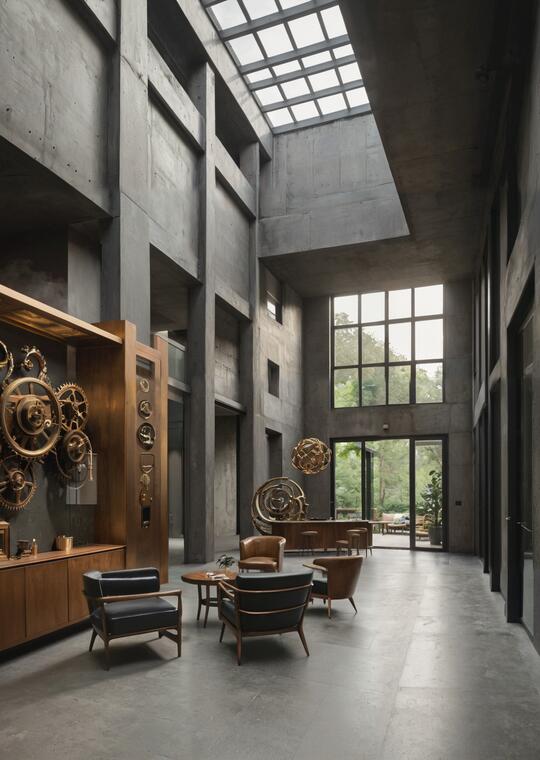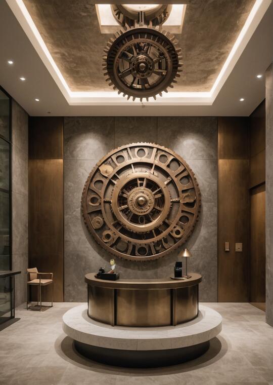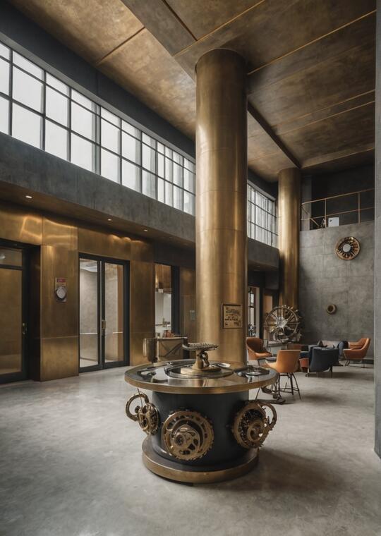 机械元素、铜铁材质、复古科技装置、蒸汽动力、手工质感、深色调配色