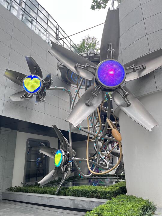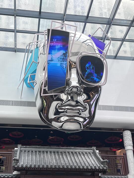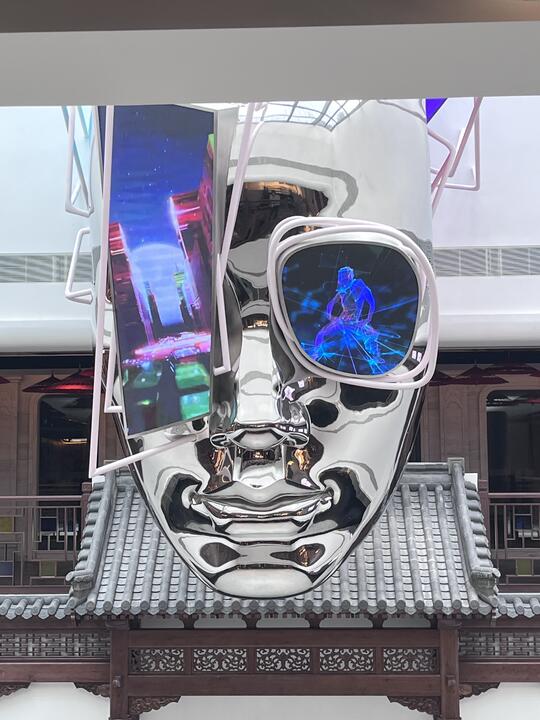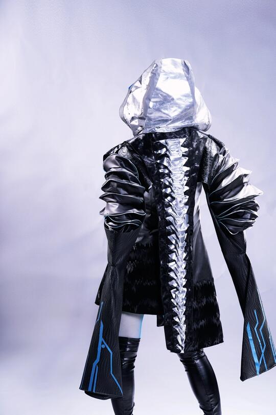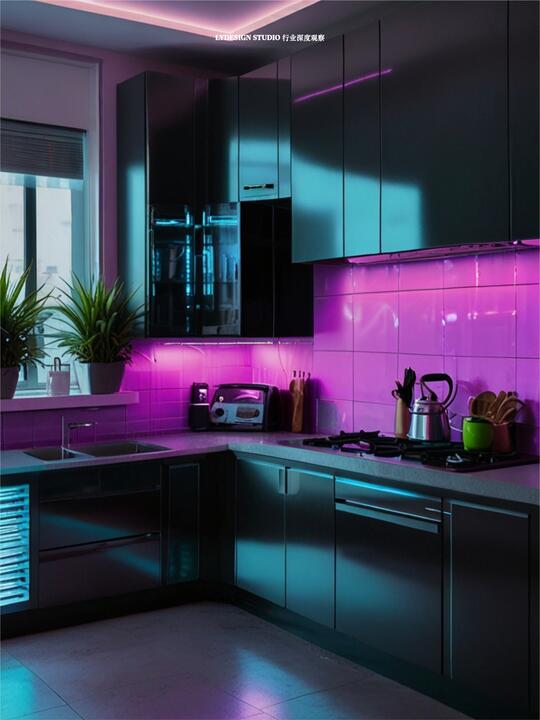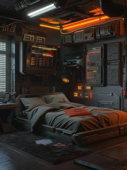材料: 自然材质:几乎没有“原生自然材质”,自然要么被消灭,要么被基因改造/人工模拟,成为科技系统的附属品 现代材质:金属(不锈钢/钛合金 、铝板 、金属网等)、玻璃、亚克力、全息膜、碳纤维、荧光涂层、合成皮革、塑料 强调冷感、发光感、光滑与反光、人工合成感和动态质感