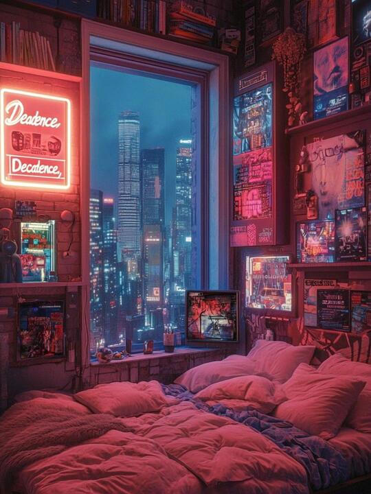 定义:是植根于反乌托邦叙事的视觉与文化美学,以高科技,低质量生活为核心矛盾,融合霓虹光效、机械义体、密集都市肌理等符号,通过冷调霓虹与暗黑基底的强烈对冲,解构科技异化下的人性困境。 拓展信息: 反乌托邦:其本质是对“理想未来”的解构与反叛,也是赛博朋克美学的底层叙事框架,通过构建技术高度发达却充满不公、压抑、疏离的社会图景,将科技进步与人类生存的矛盾视觉化,为赛博朋克的色彩、形态与符号提供精神锚点。