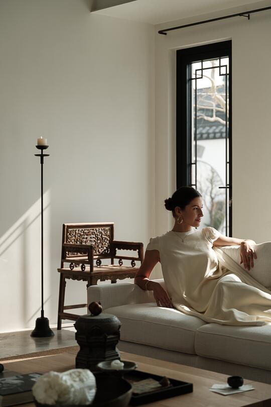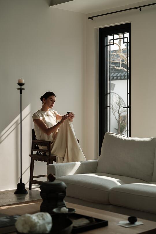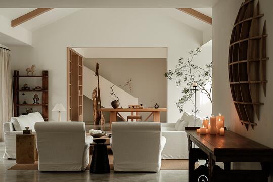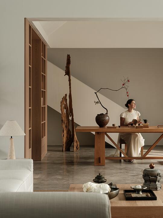 自然材质、中性色调、低矮家具、框景与借景、不对称平衡、静默与留白
