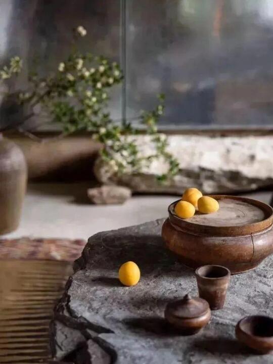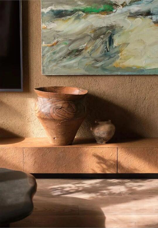 粗陶、不完美、斑驳;低饱和自然色(灰白、陶土色),原始材料(粗陶、原木、亚麻),手作感、不规则、空寂留白。