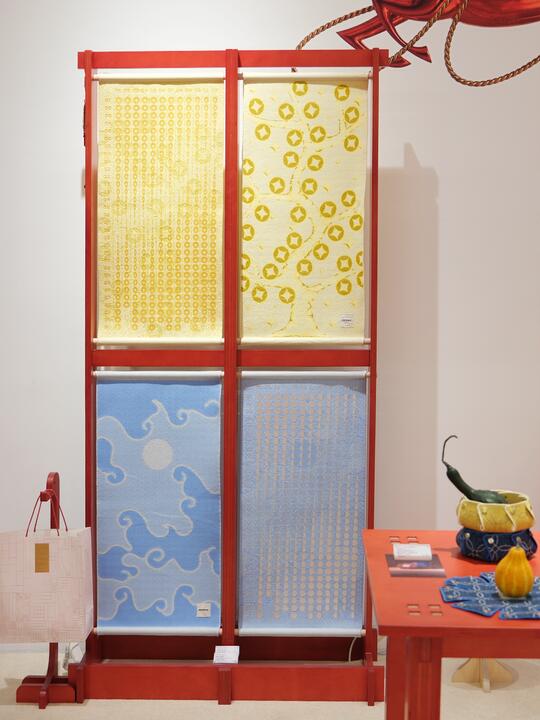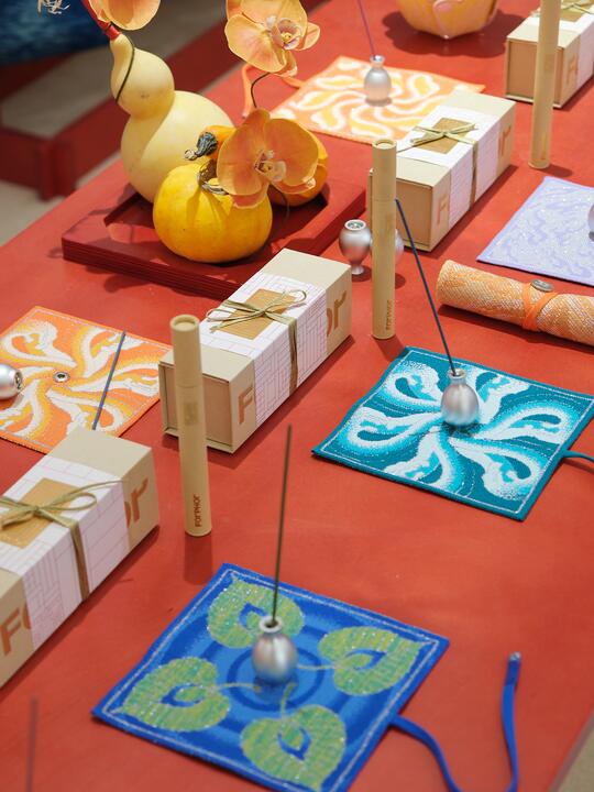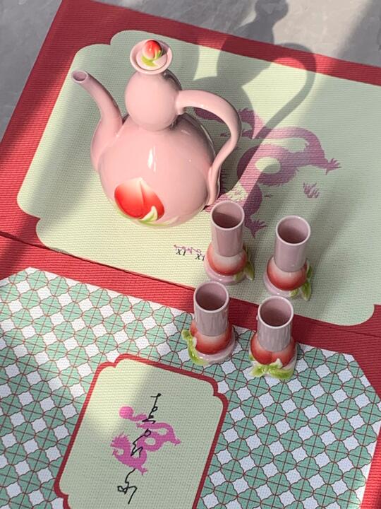 盘扣、立领、宽袖、对称结构、祥云、龙凤图案、斜襟/对襟、刺绣、流苏、提花、棉麻、真丝、陶瓷、香云纱、宋锦、水墨印花、山水纹样、书法元素、传统织锦、刺绣工艺