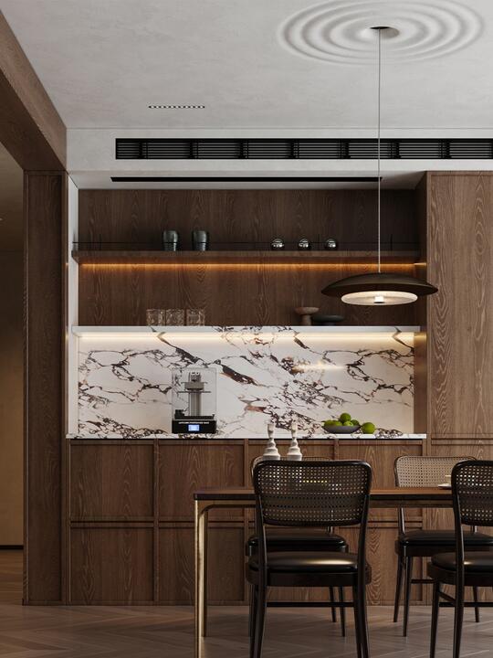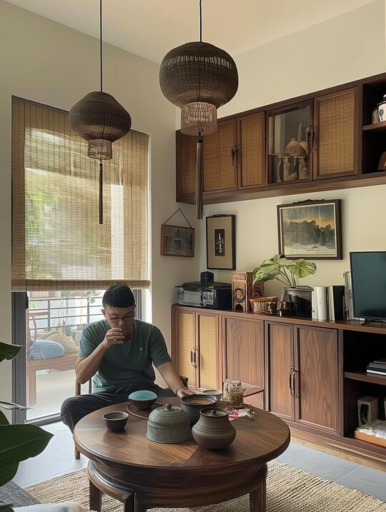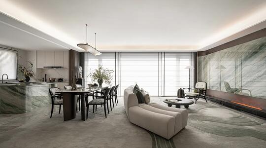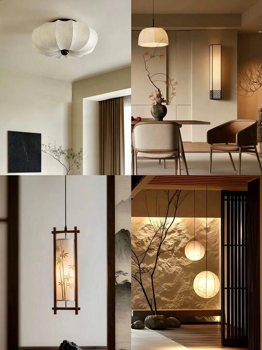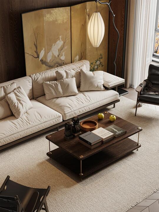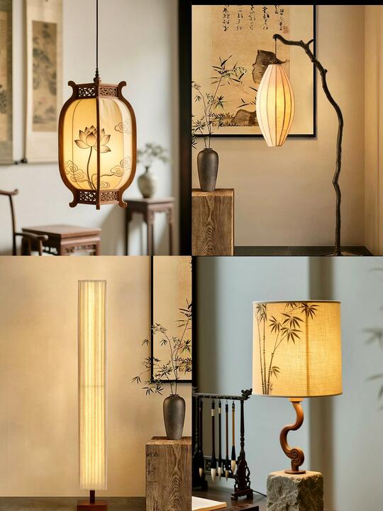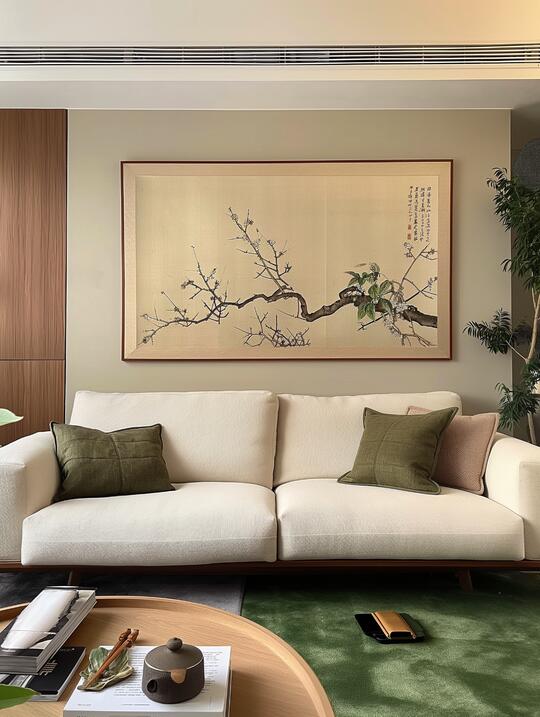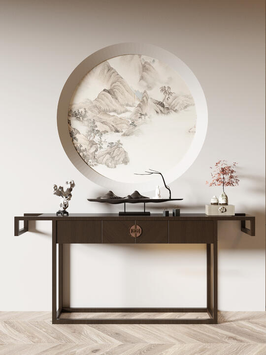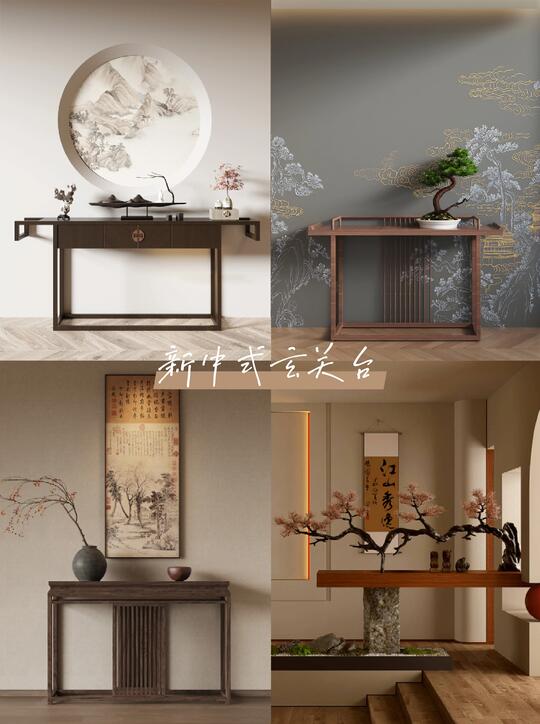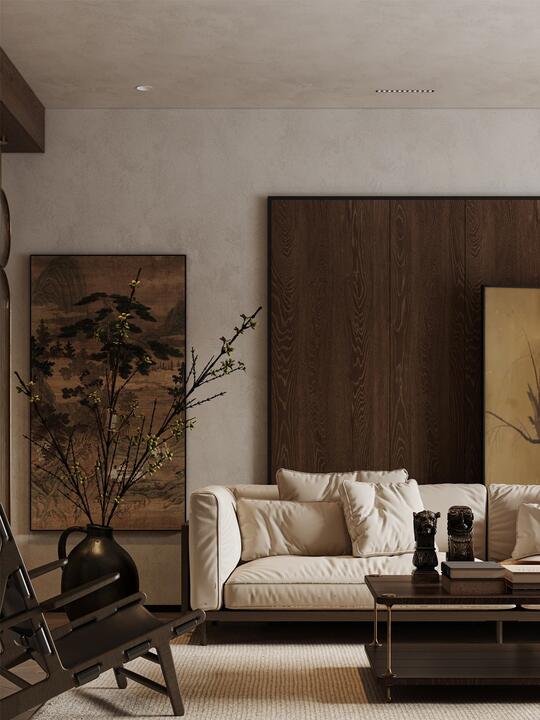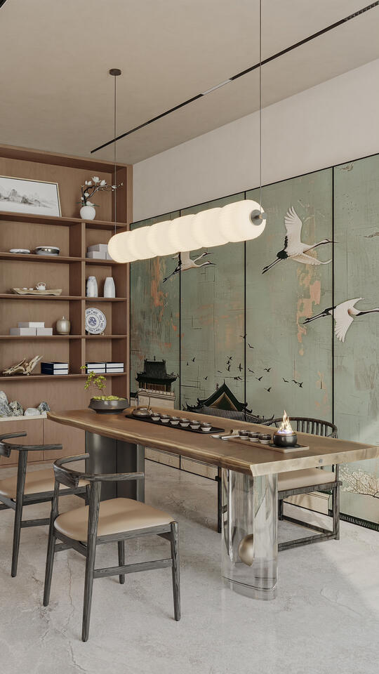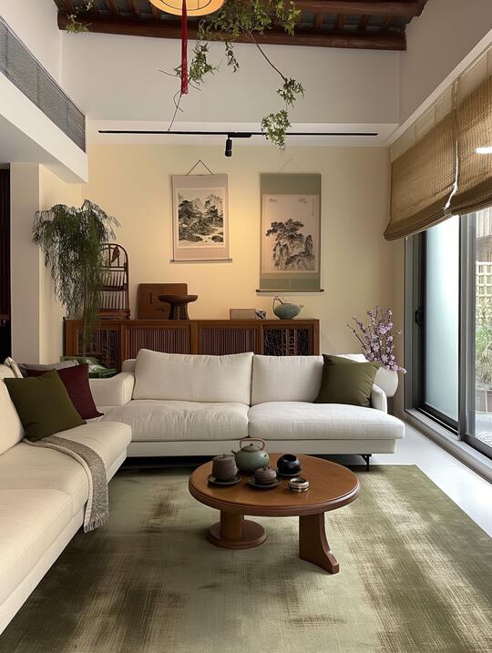 材料: 自然材质: 实木(胡桃木、橡木、榆木、黑檀等深色或原木色)、石材(水墨山水纹大理石)、竹、藤、棉麻、真丝、陶瓷、香云纱、宋锦等。 现代材质: 金属(黄铜、黑钢)、玻璃、混凝土、亚克力(形成质感对比) 触感:强调哑光质感