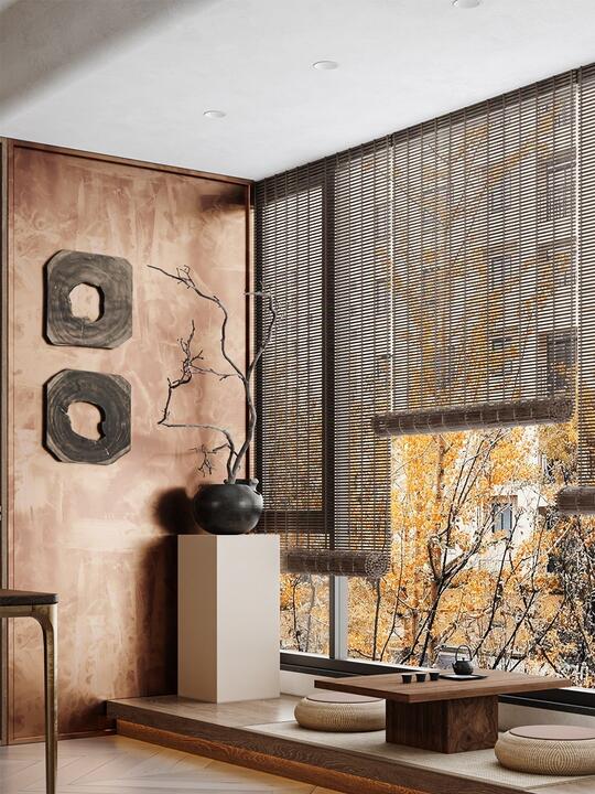 色彩: 主色调: 以黑、白、灰、米色、大地色系(原木色、咖色)(营造宁静氛围) 辅色局部点睛: 用饱和度较低的传统色进行点缀,如中国红(朱砂红)、靛蓝、松石绿、帝王黄(小面积),或取自自然的黛绿、秋香色等。
