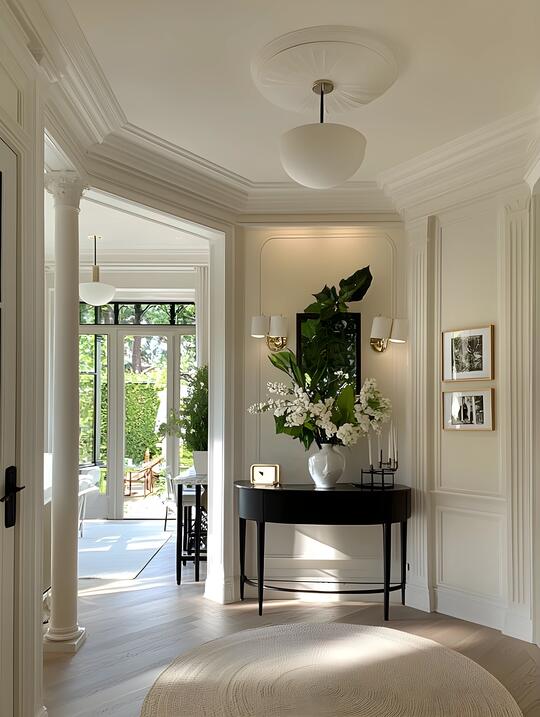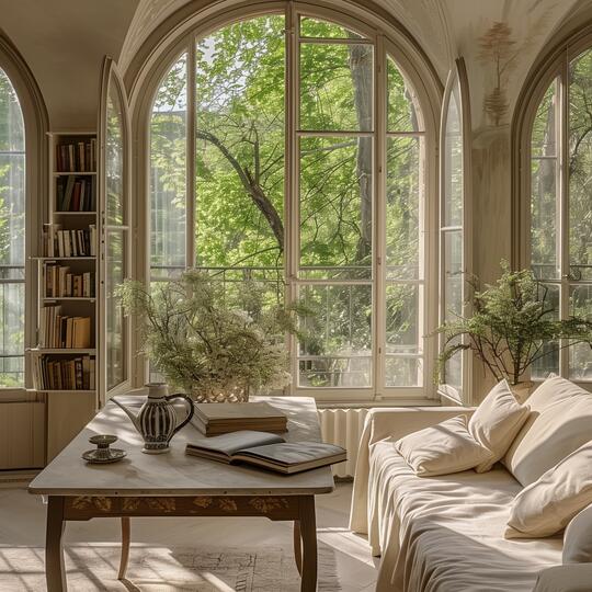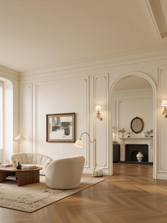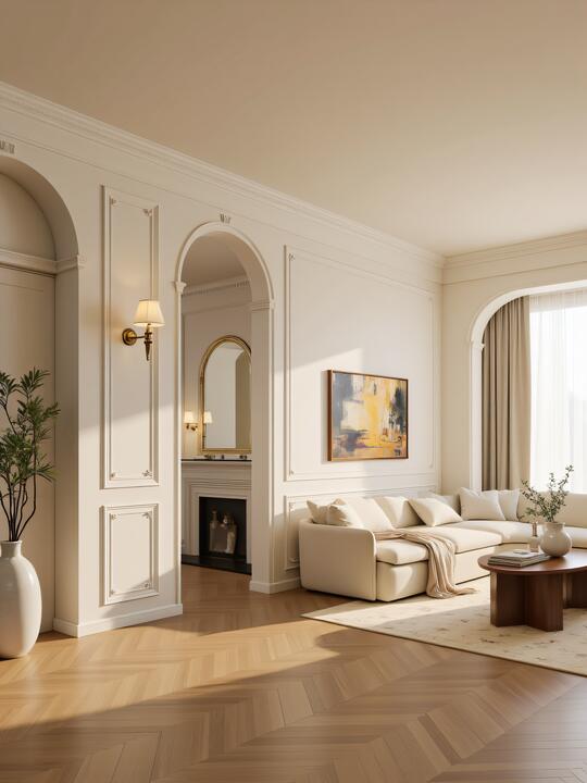 形态: 拱形结构 墙面分层:如油画画框 对称与轴线 家具与产品曲腿形态、雕花与镂空、弧形与椭圆 人字拼 / 鱼骨拼地板 高窗 + 长帘