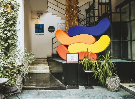 色彩: 主色调:红、黄、蓝三原色,其他高饱和度流行色,玫红色、橙色 辅色:黑、白、紫、蓝、本戴点 (由青色、品红、黄色小圆点组成的网格) 核心是夸张、艳丽、炫目,但通过白色点缀和协调与对比关系的把握,实现活泼生动又相对和谐的空间氛围,