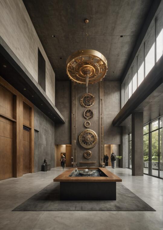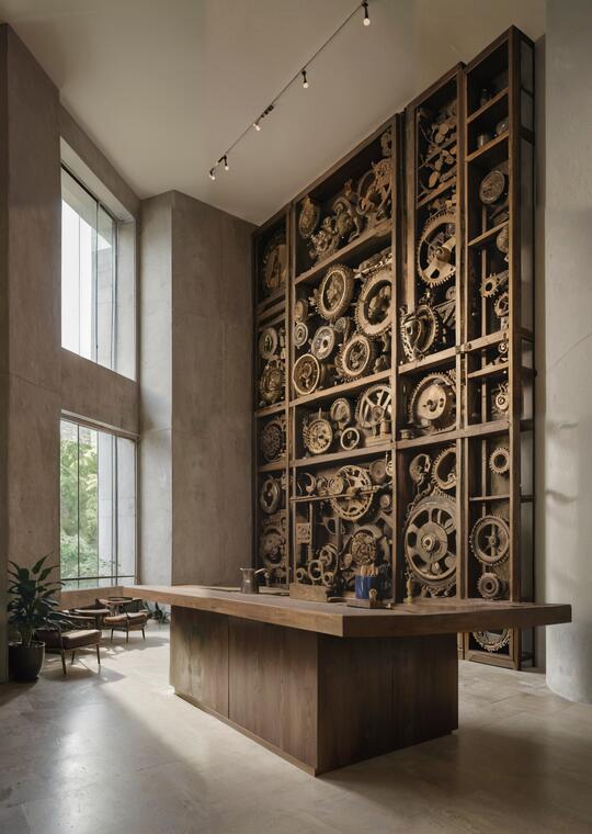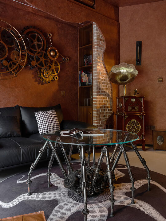 机械元素、铜铁材质、复古科技装置、蒸汽动力、手工质感、深色调配色