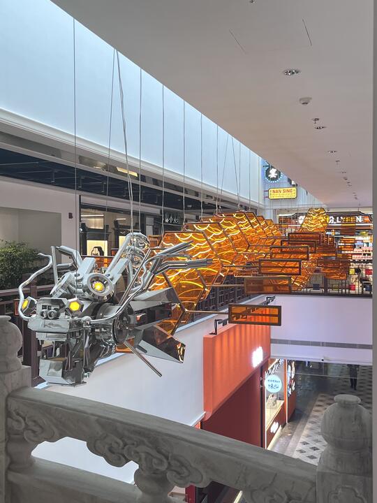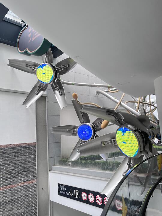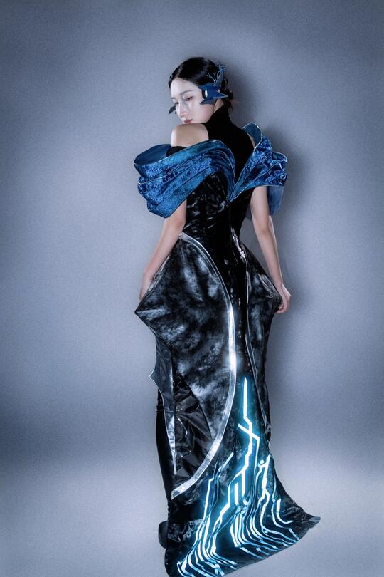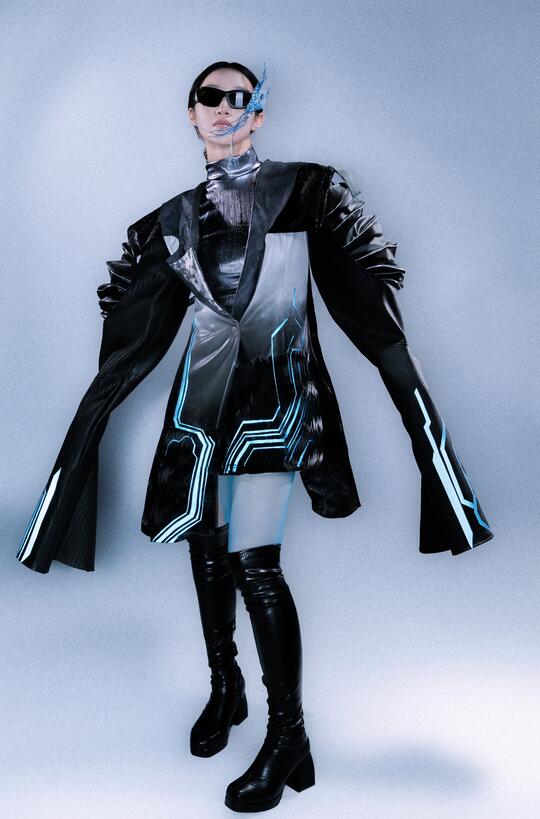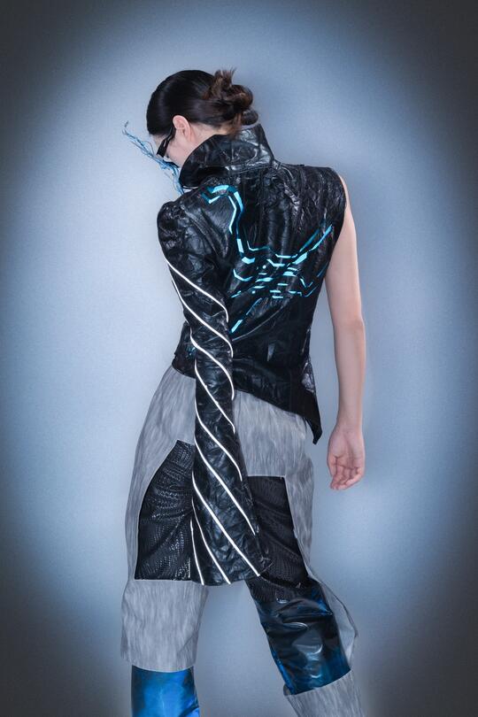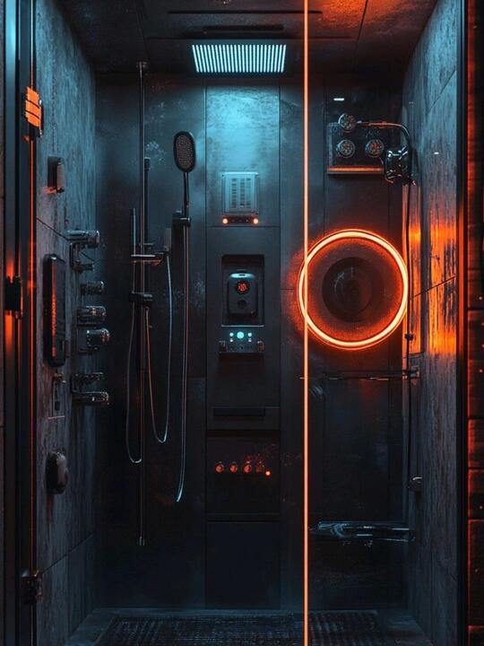 材料: 自然材质:几乎没有“原生自然材质”,自然要么被消灭,要么被基因改造/人工模拟,成为科技系统的附属品 现代材质:金属(不锈钢/钛合金 、铝板 、金属网等)、玻璃、亚克力、全息膜、碳纤维、荧光涂层、合成皮革、塑料 强调冷感、发光感、光滑与反光、人工合成感和动态质感